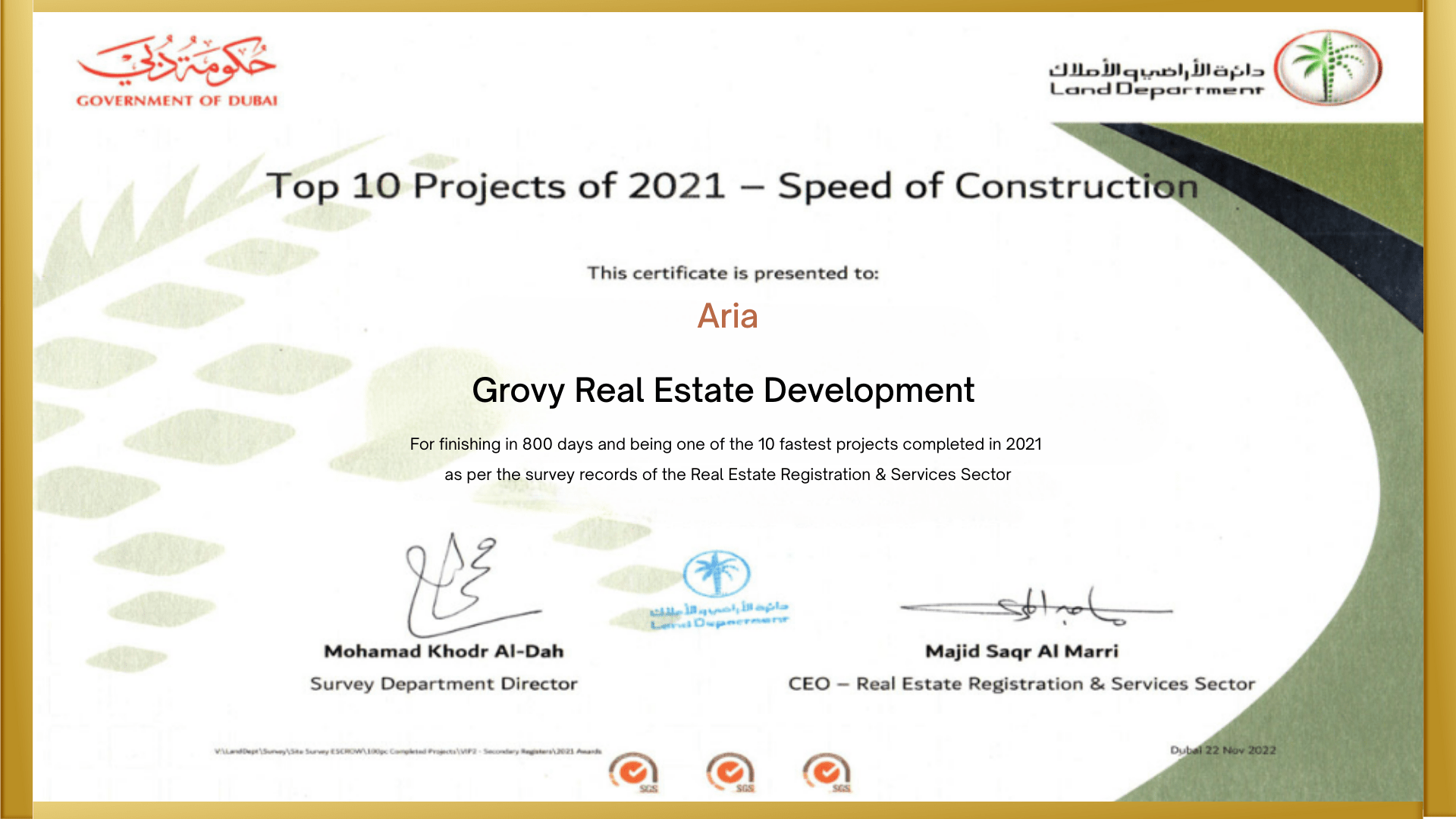 ARIA by Grovy wins the “Top 10 Projects in 2021 – Speed of Construction” in Dubai awarded by Government of Dubai Land Department
